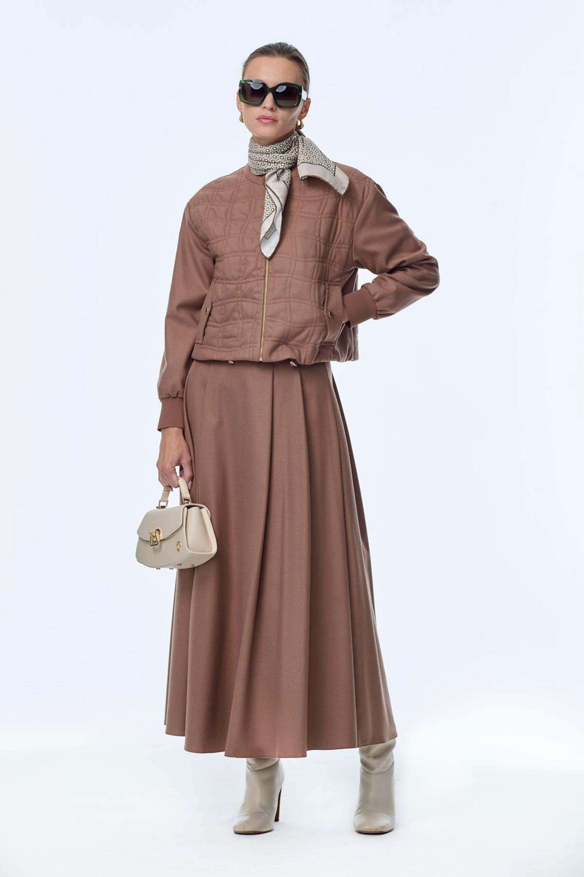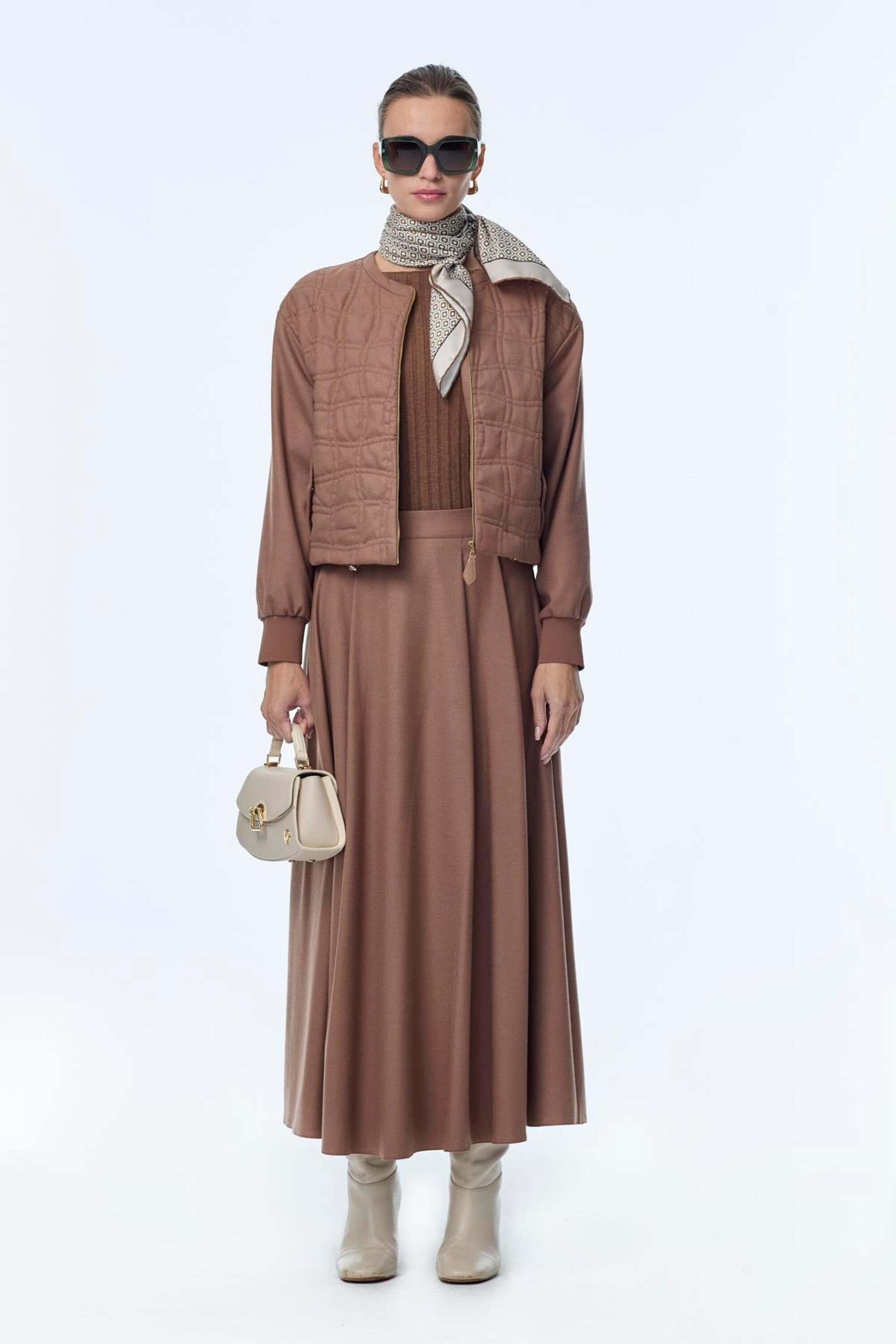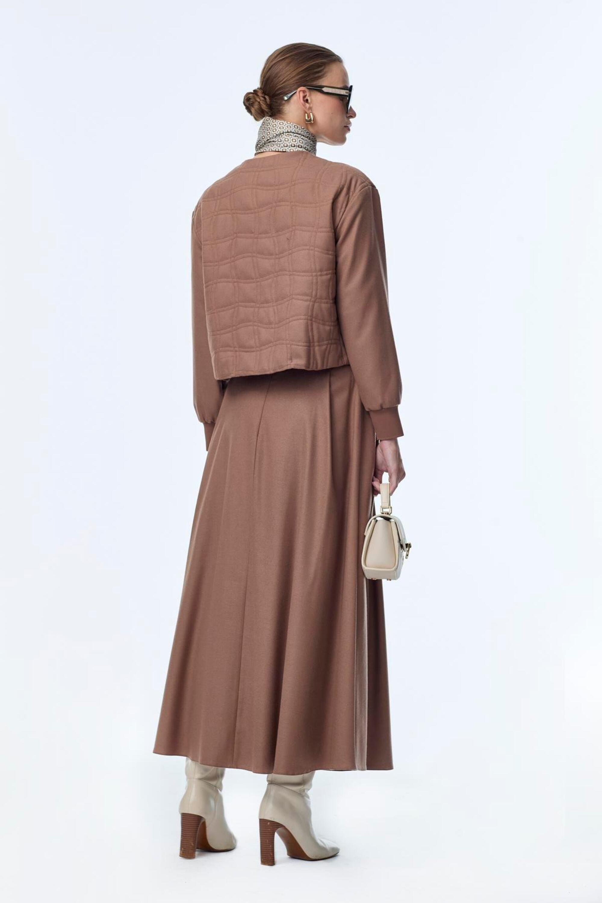 Desenli kumaş, Fermuar kapamalı üst, Cep detaylı, Uzun kollu, Geniş kesim uzun etek, İkili takım