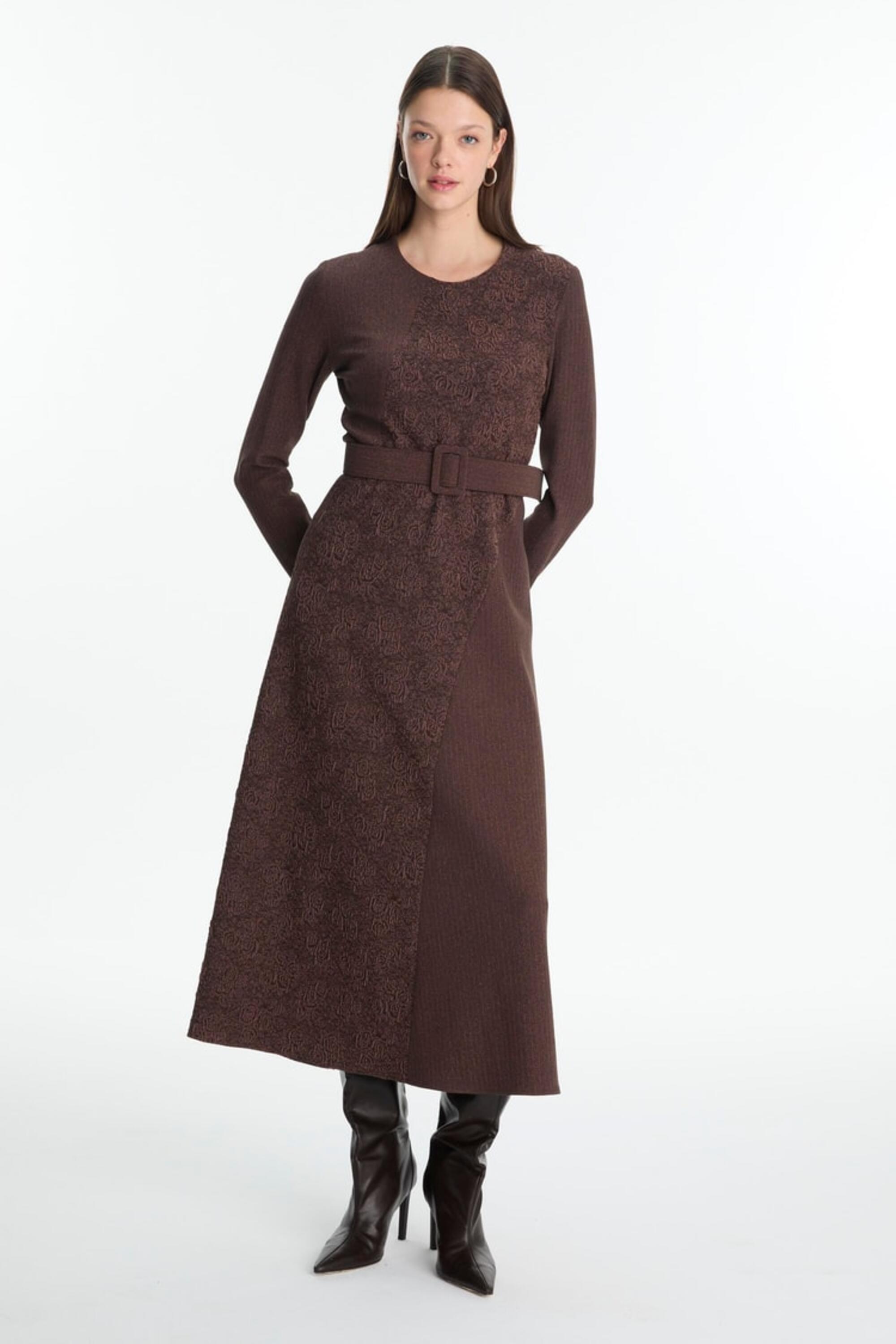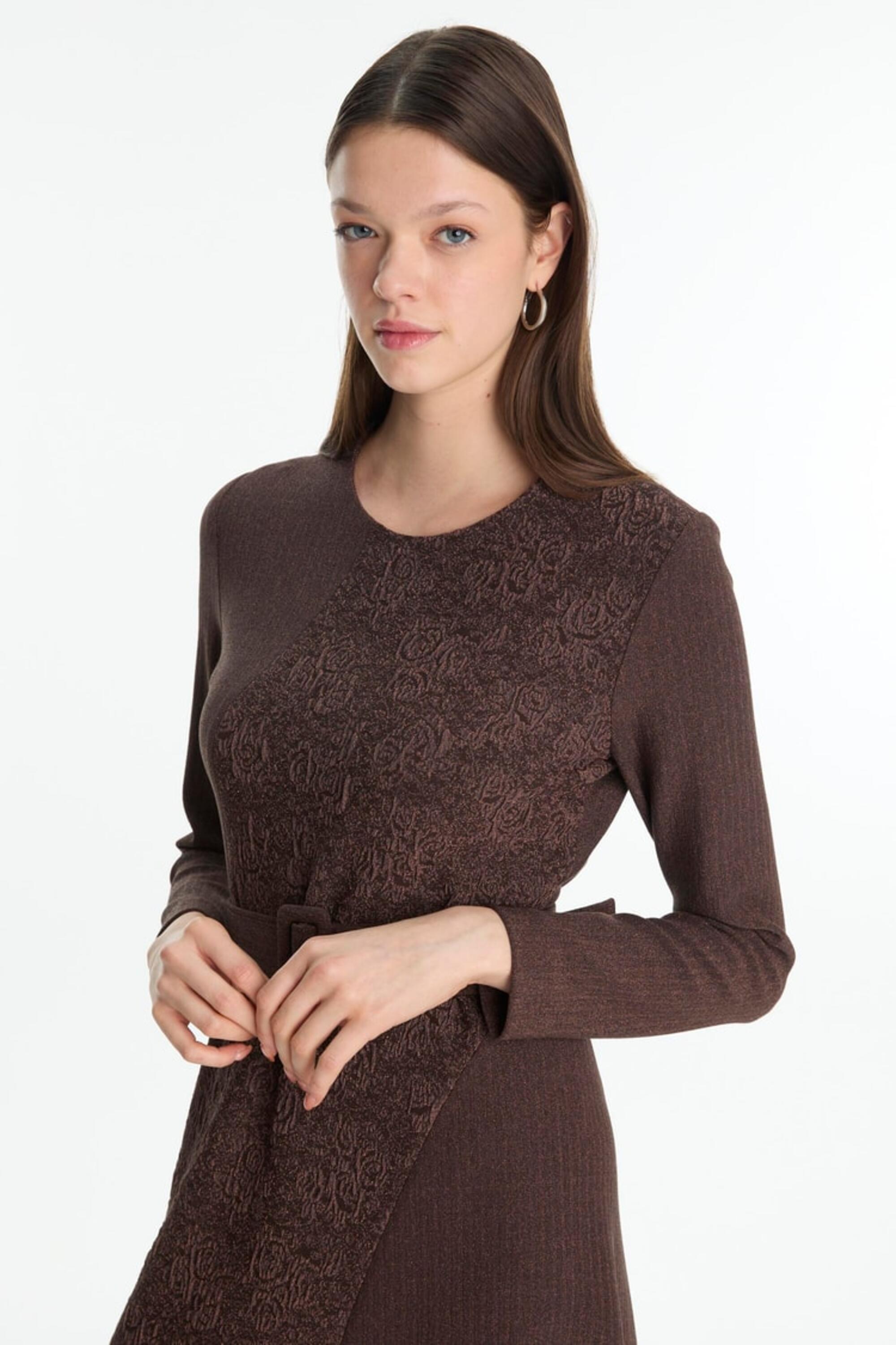 Ürün Detayları:Jakar detaylı, Kemerli, Uzun kollu, Yuvarlak yaka, Uzun elbise, Rahat kesim