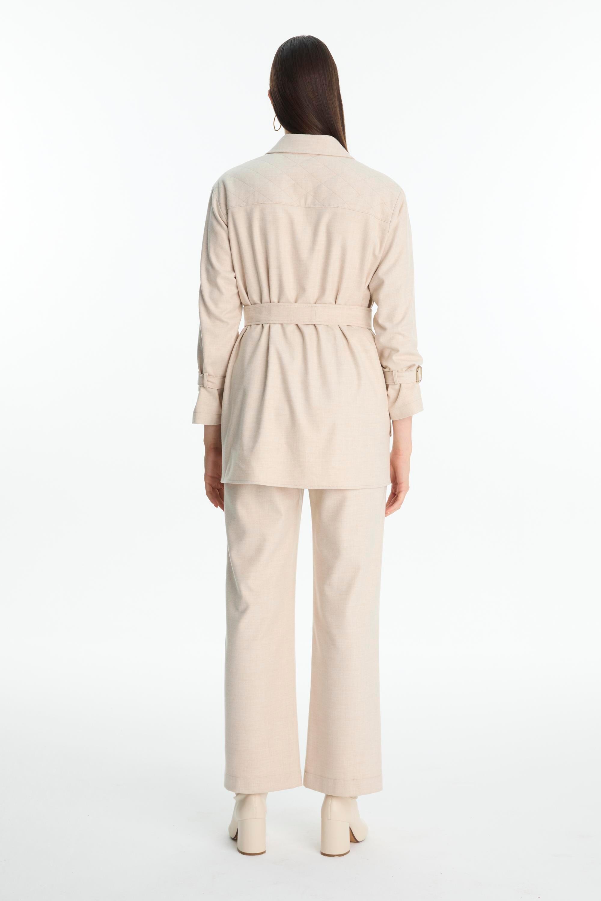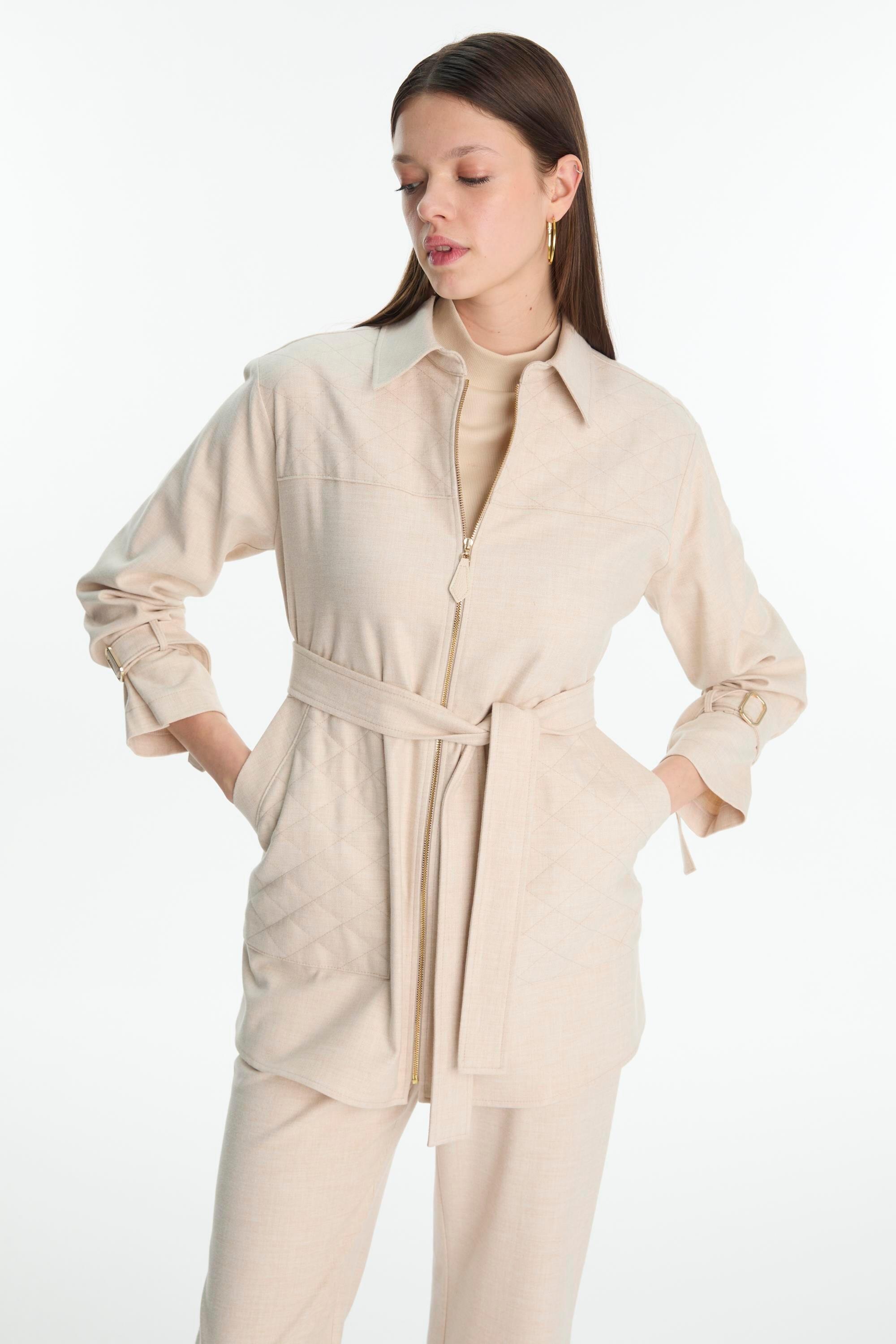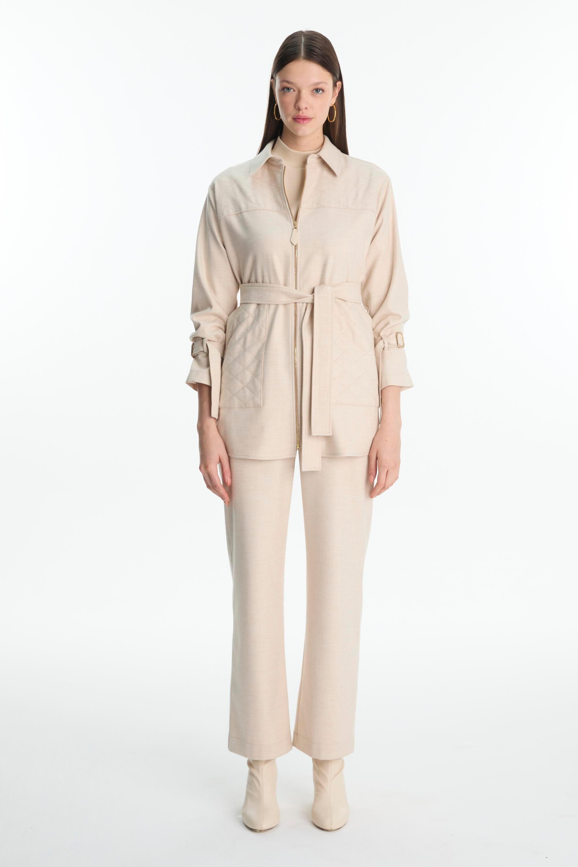 Fermuar kapamalı ceket, Kuşak detaylı, Cepli tasarım, Uzun kol, Düz kesim pantolon, Rahat kalıp