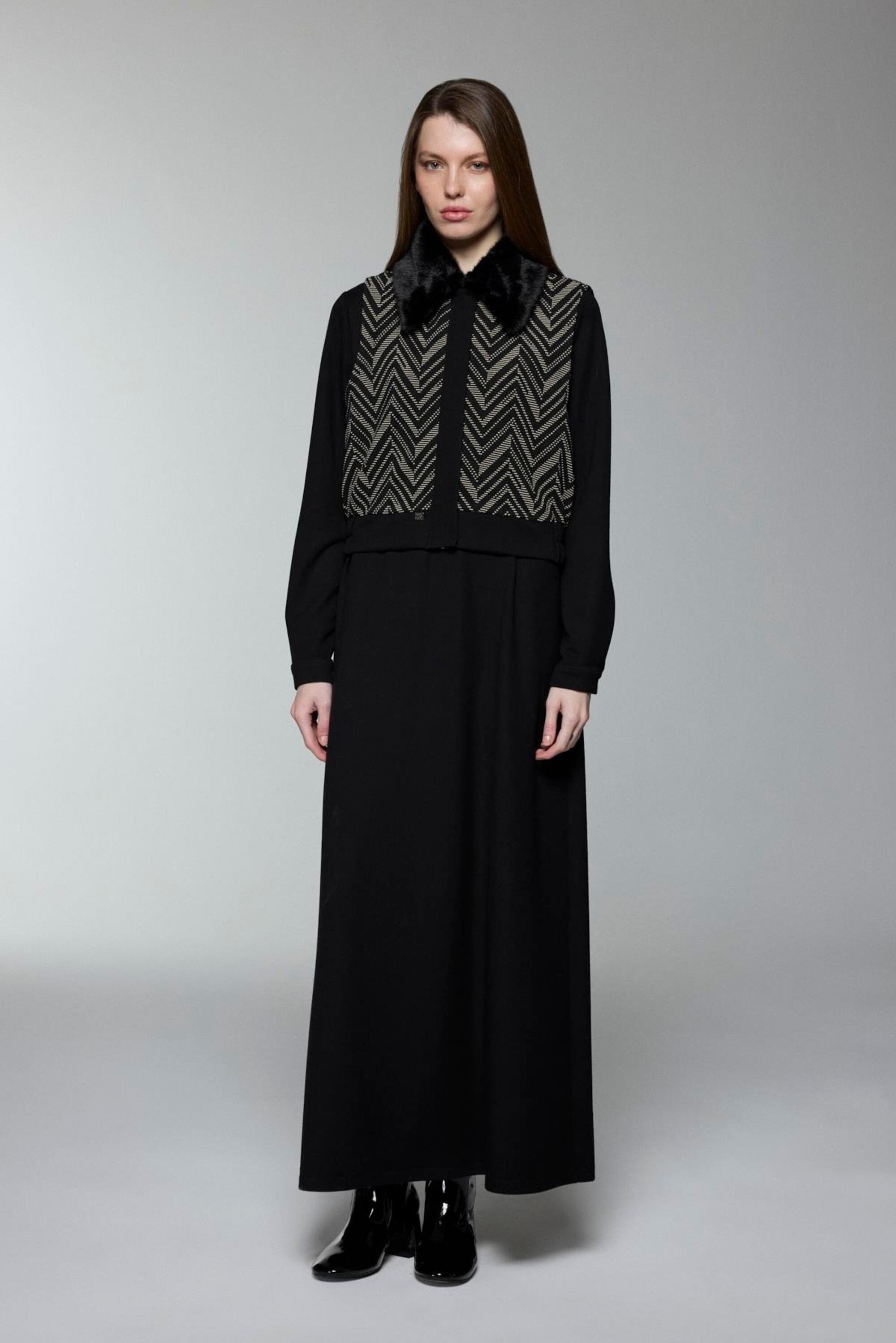 KÜRK YAKA DESENLİ YELEKLİ ELBİSE