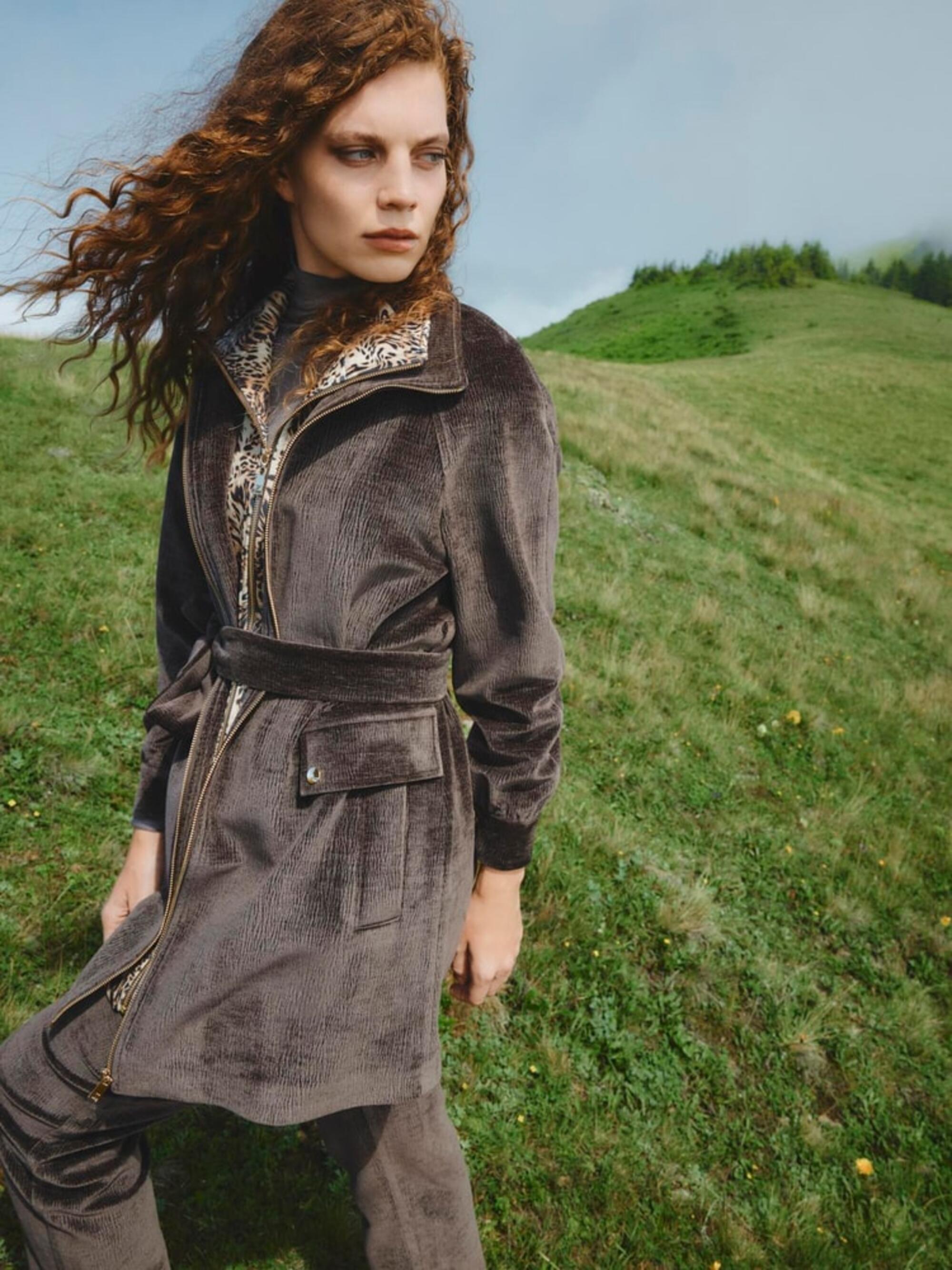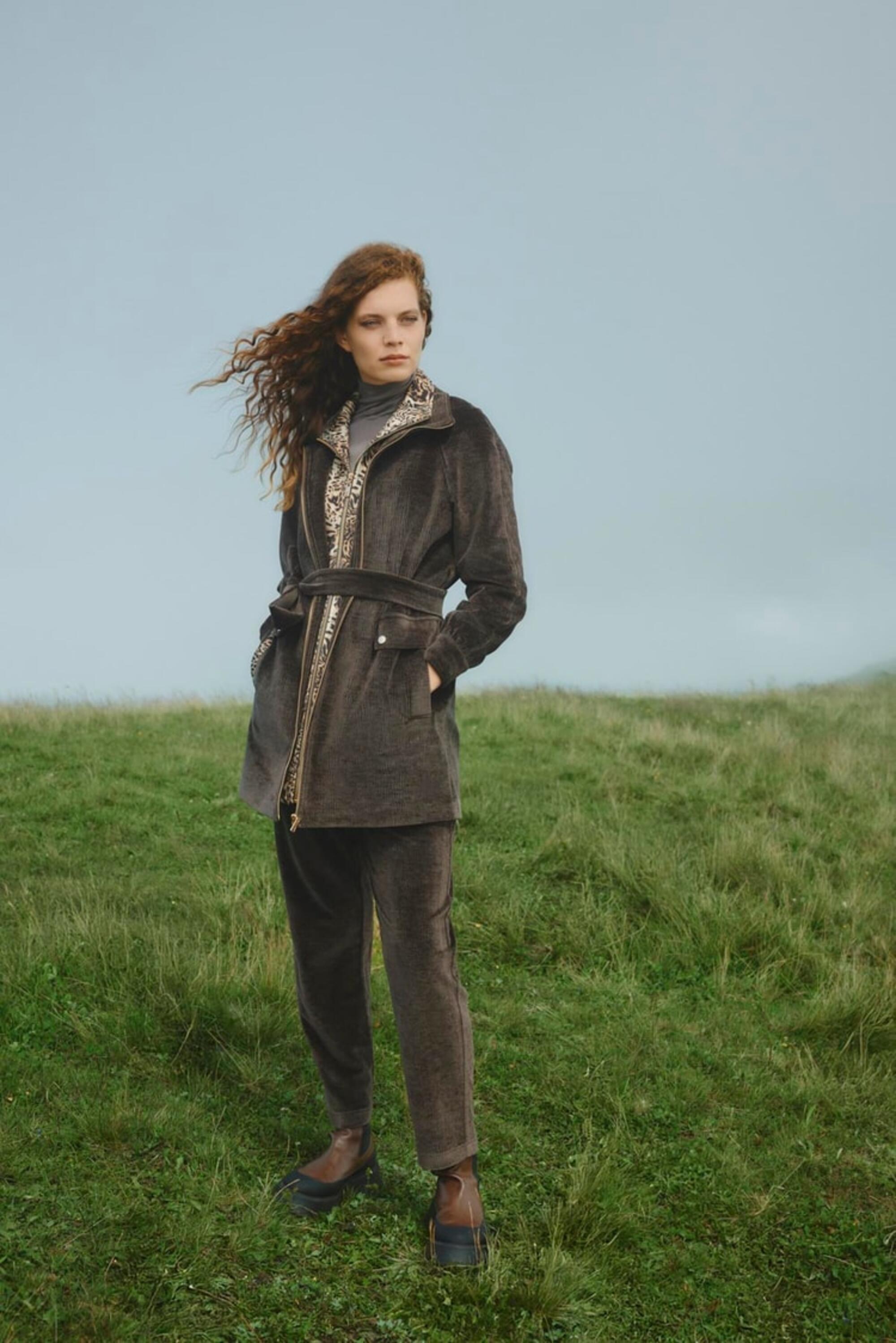 Modern tasarımı ve iç kısmındaki leopar desen detayıyla dikkat çeken ceket, yumuşak dokulu kumaşı ve fermuarıyla konforu şıklıkla bir araya getiriyor. Belden bağlamalı kemeriyle vücut hatlarını zarifçe vurgularken, şehirli stilin vazgeçilmez parçası olmaya aday.