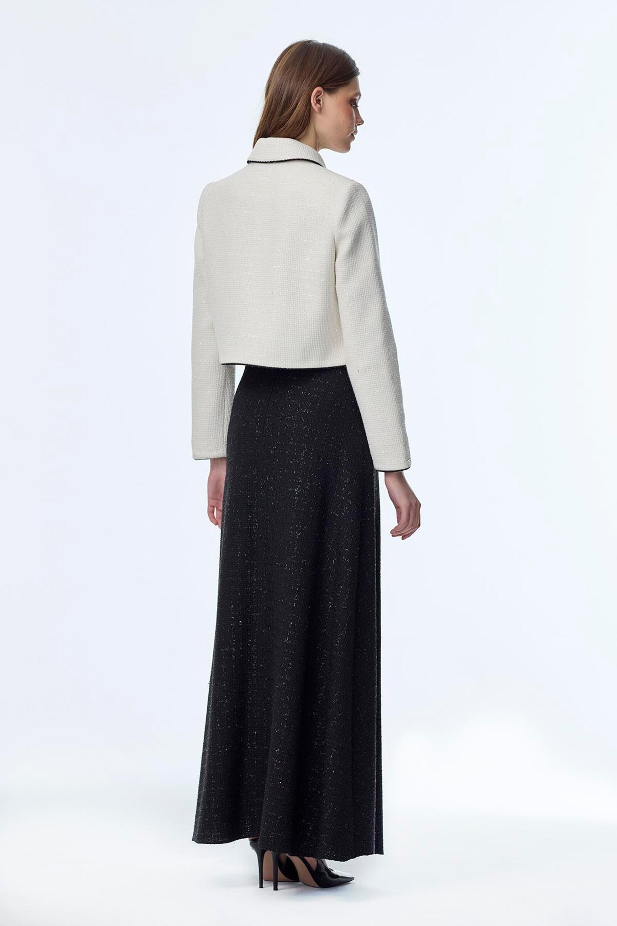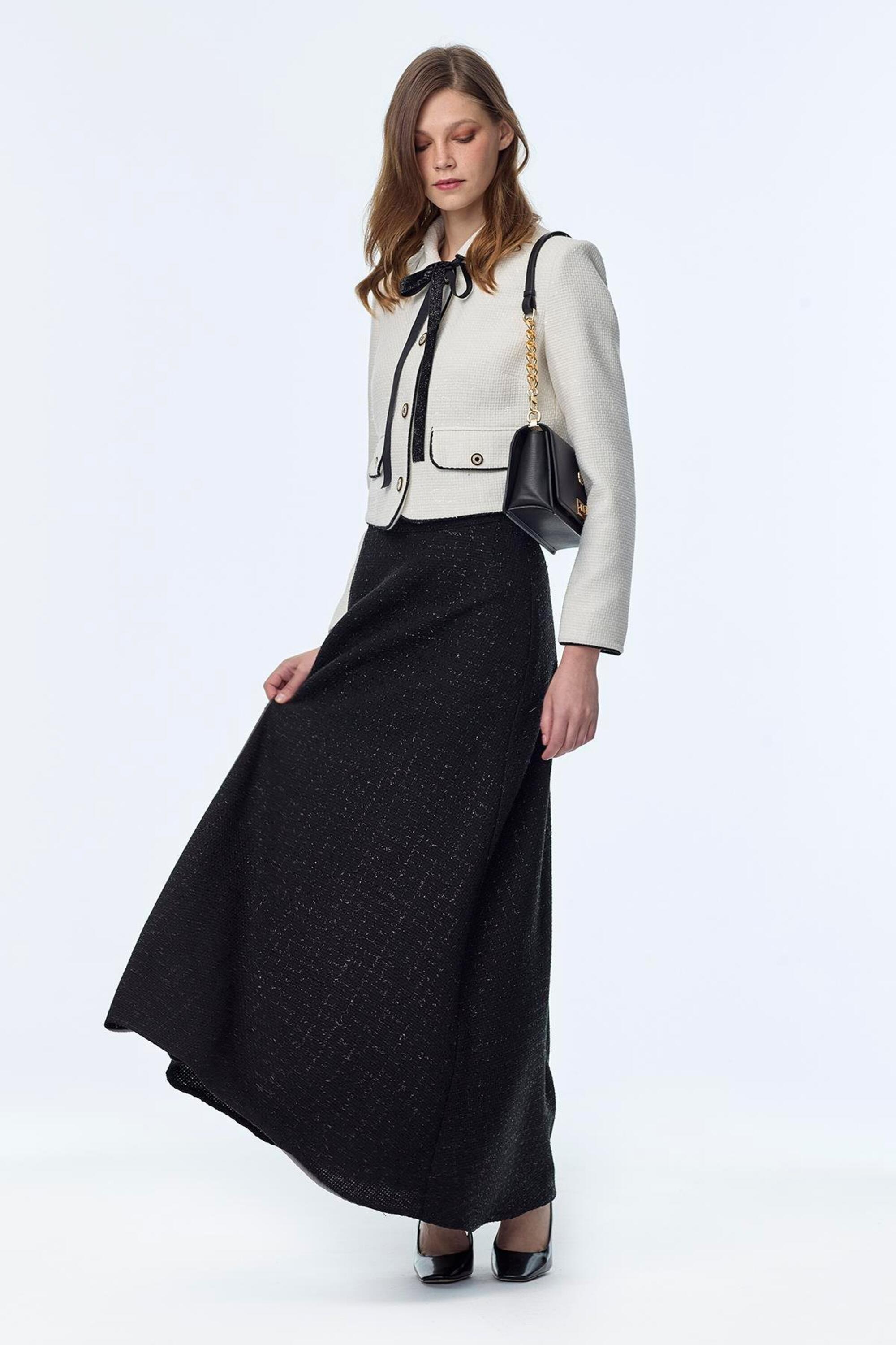 Zarif ve modern çizgileriyle öne çıkan takımımız gold düğme detaylarıyla şıklık kazanırken uzun etek formu ile klasik ve sofistike bir görünüm sunar. Hem özel davetlerde hem de günlük şıklıkta tercih edebileceğiniz bu takım gardırobunuzun vazgeçilmezi olacak.