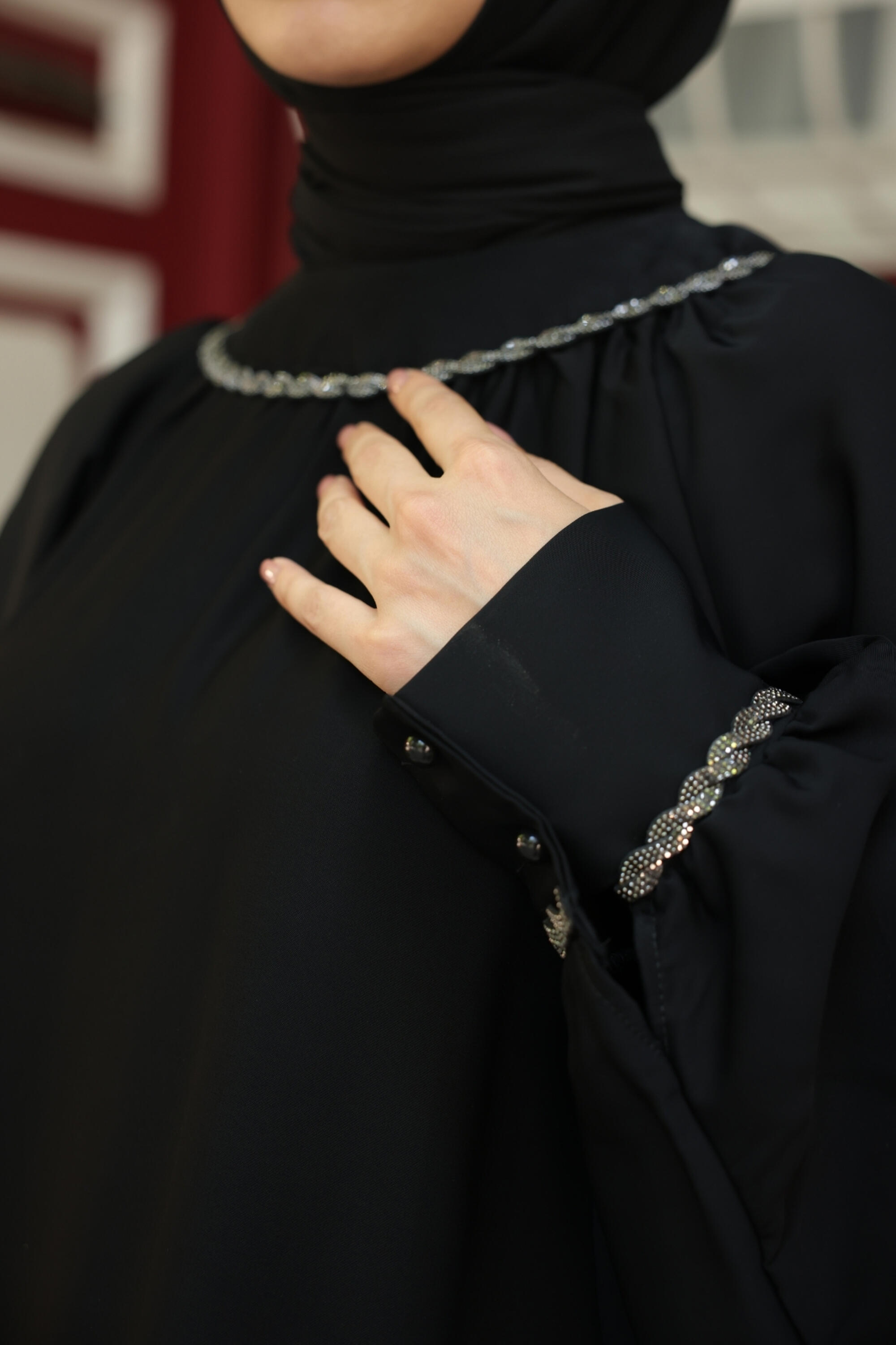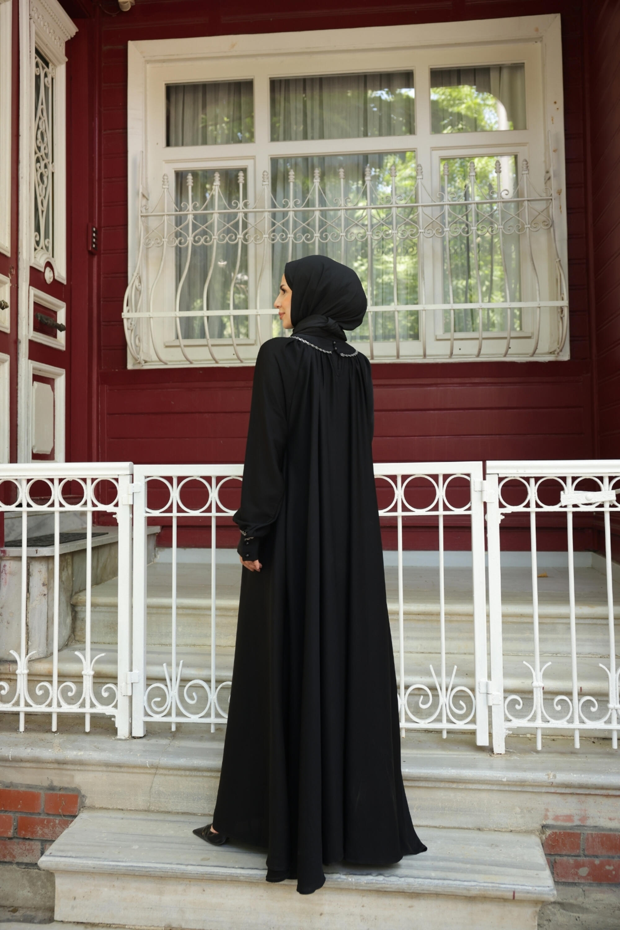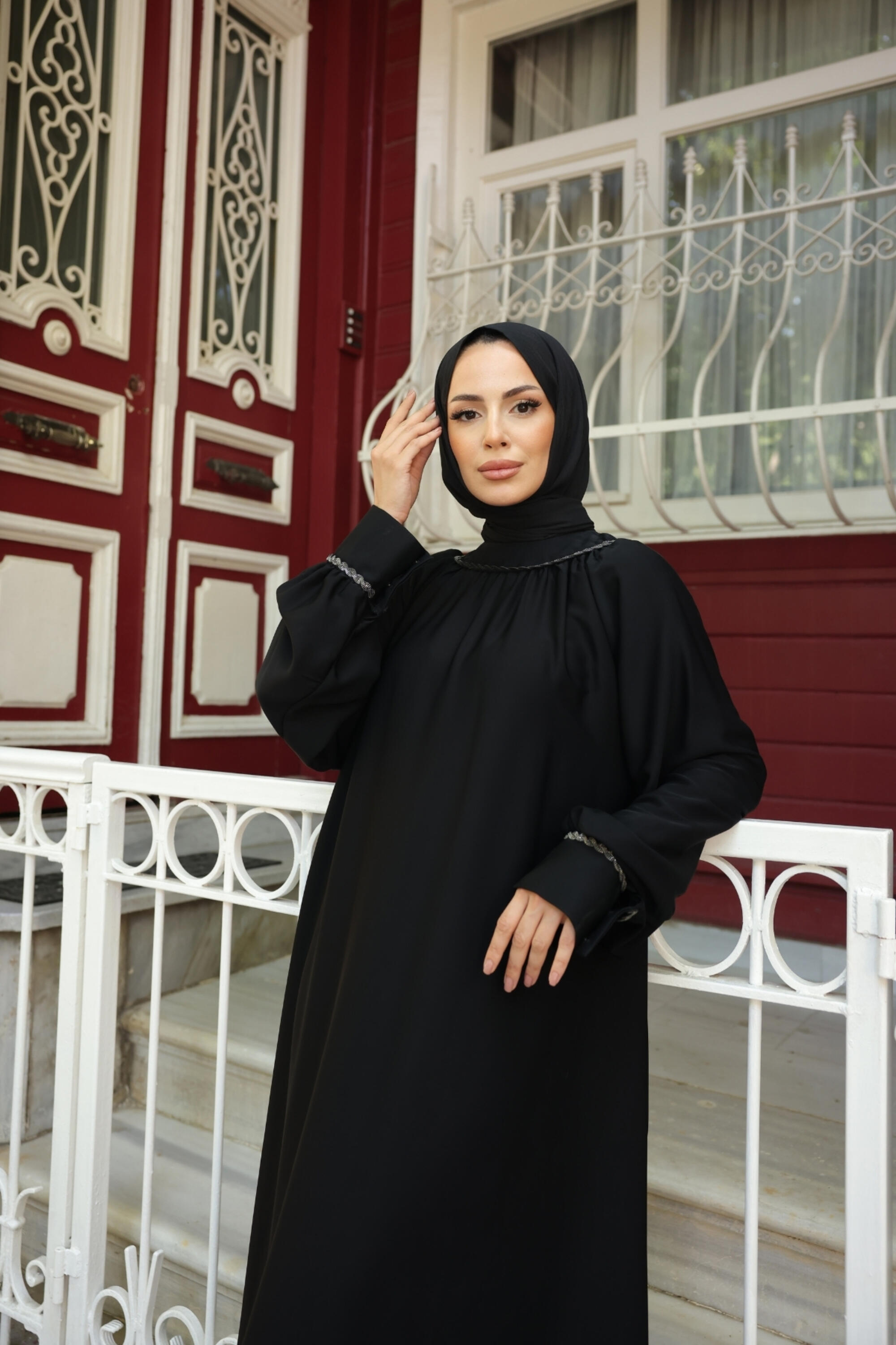 Işıltılı ve sade şıklığı bir arada sunan bu özel tasarım abaya, 38-52 beden aralığına uygun standart kalıpta üretilmiştir. Akışkan ve hafif yapısıyla öne çıkan Dubai ipeği kumaşı sayesinde gün boyu konfor sağlar.