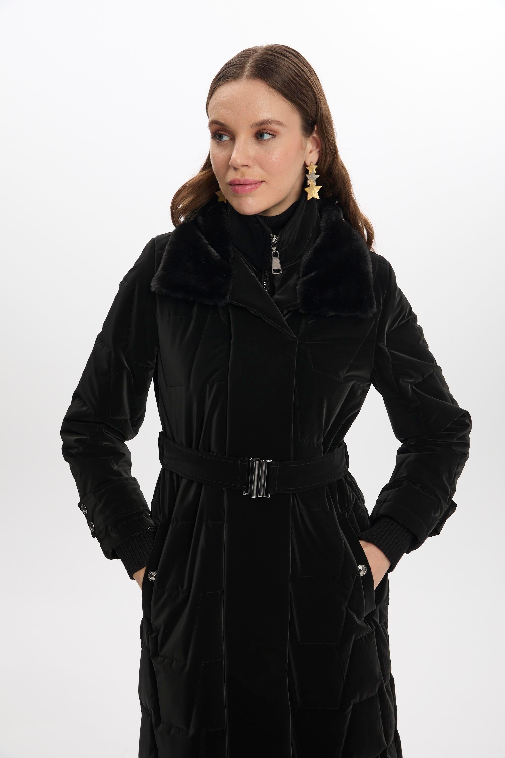 YAKA KÜRK DETAYLI KEMERLİ MONT