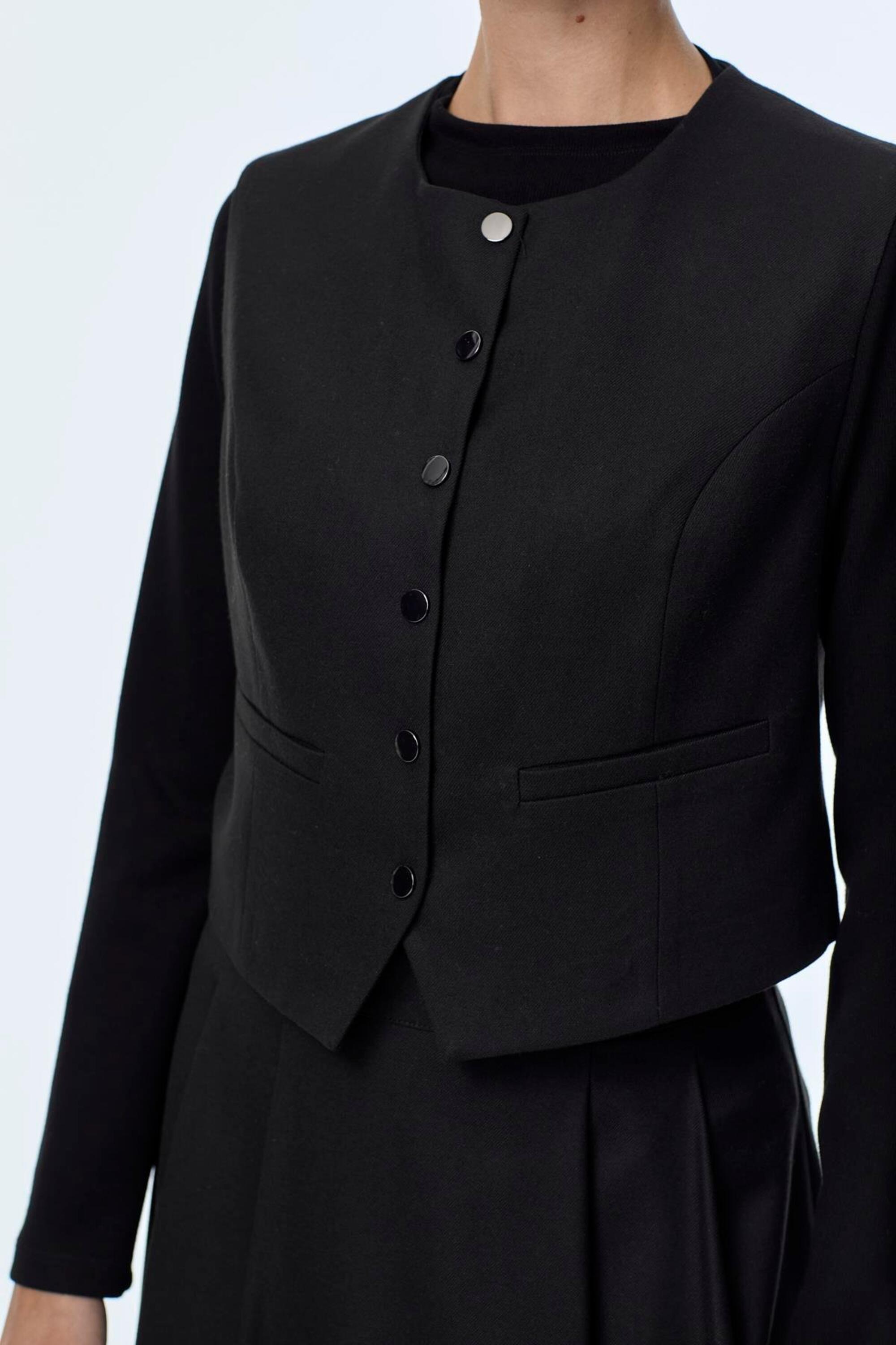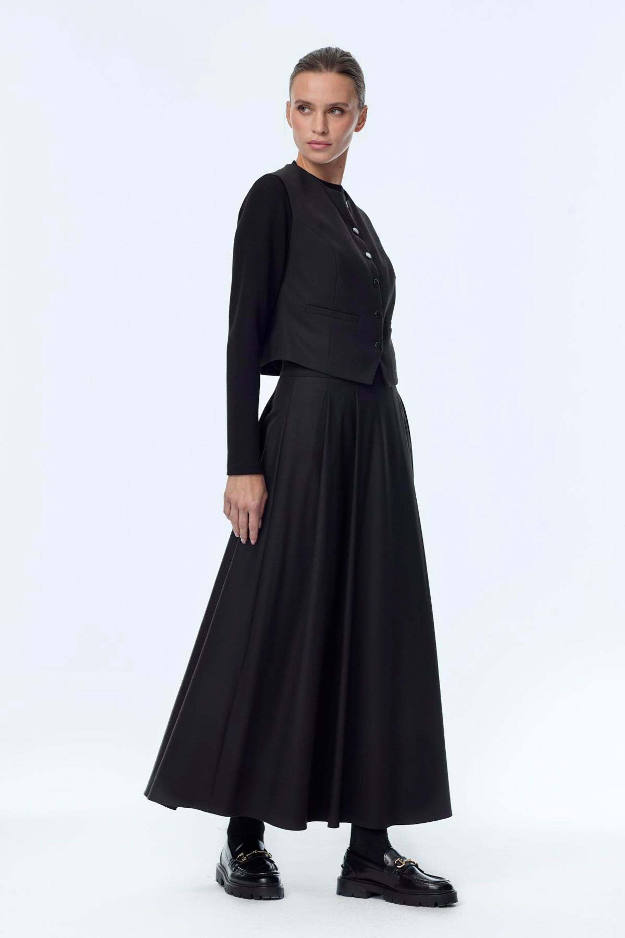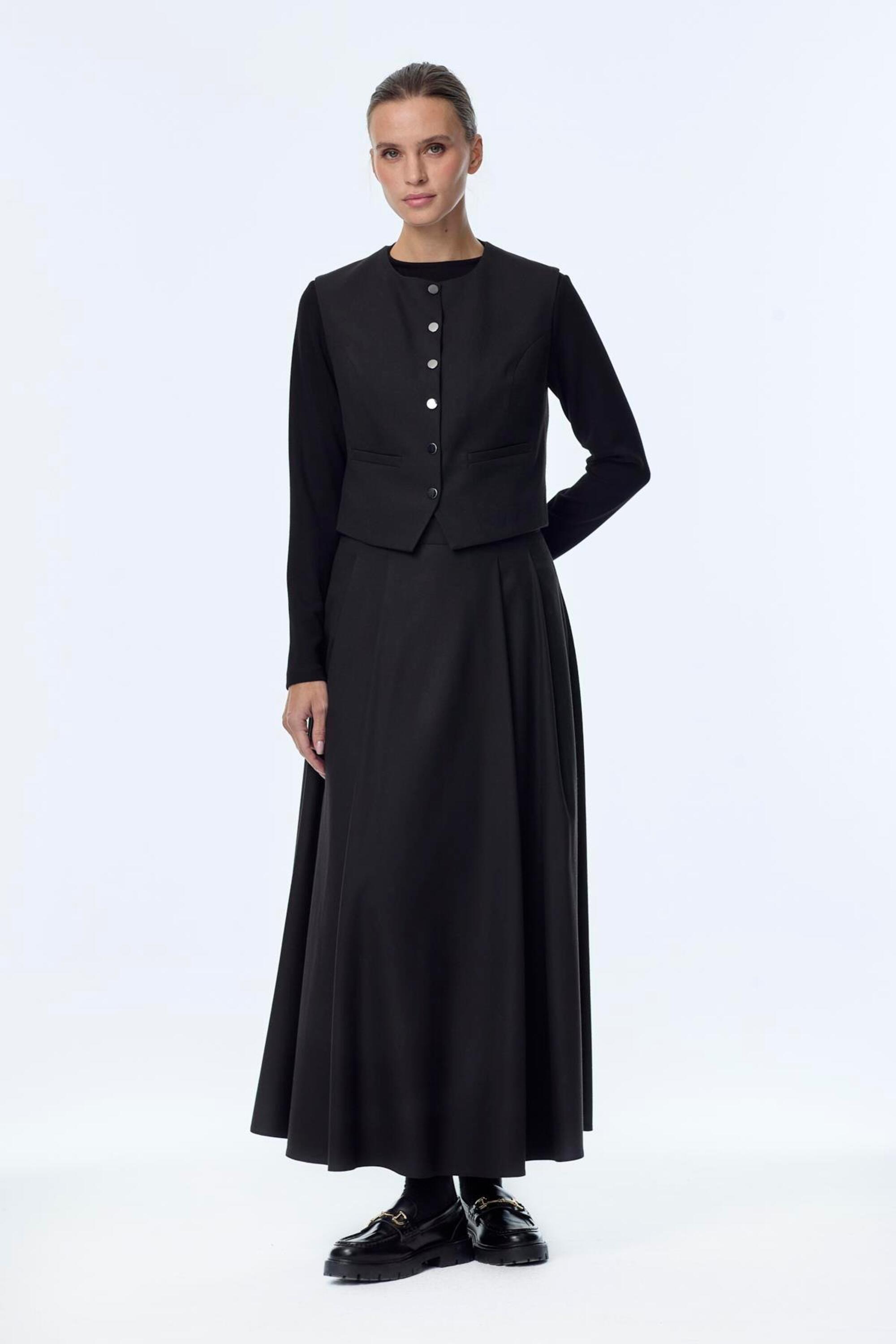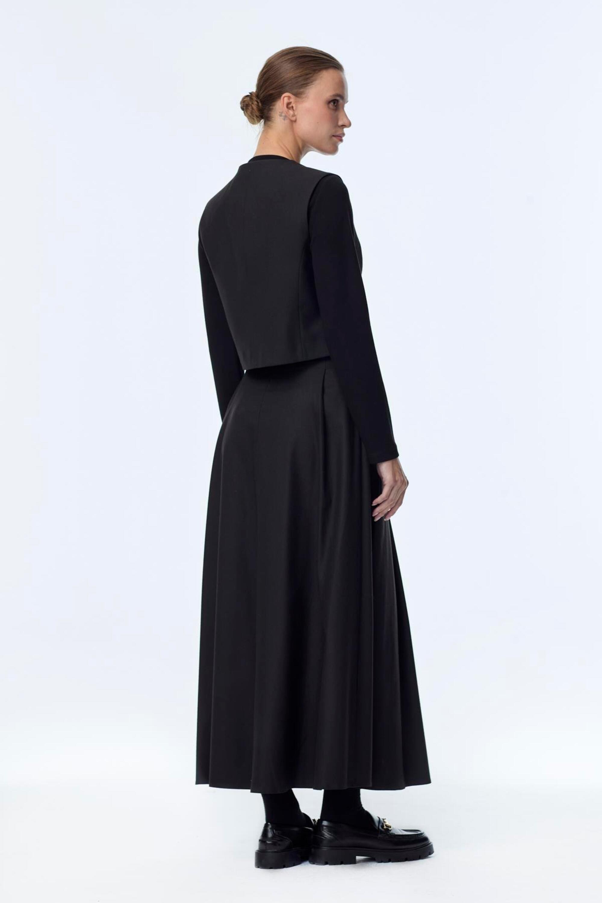 Düğme kapamalı kısa yelek, Kolsuz içlik, Geniş kesim uzun etek, Üçlü takım